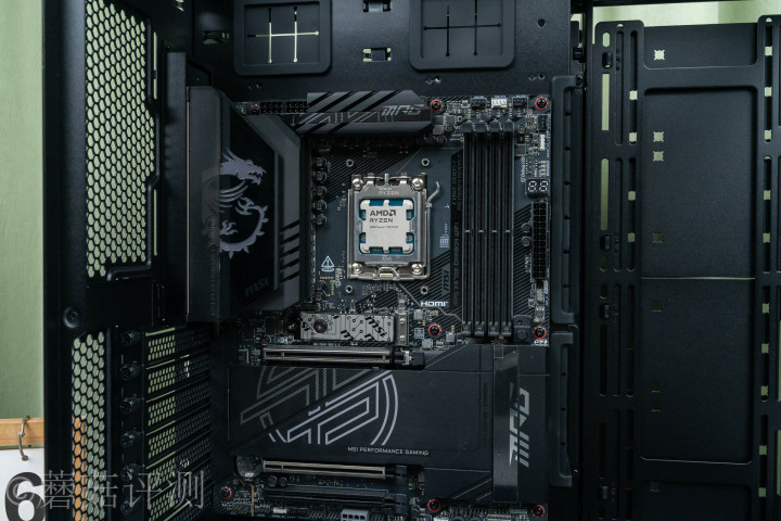 ▼主板的右侧,是机箱的侧面电扇位,这里比拟较于主板的固定平面,有一个较深的台阶,便捷装配一些水冷排的同期,也不会影响主板、显卡的装配 。