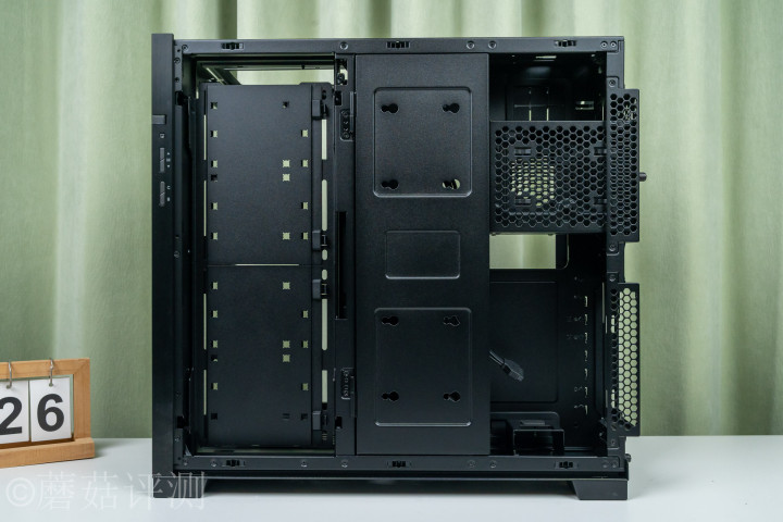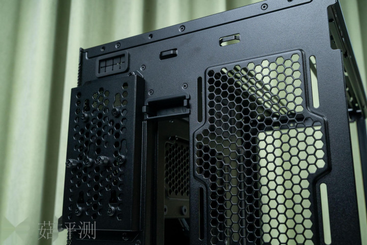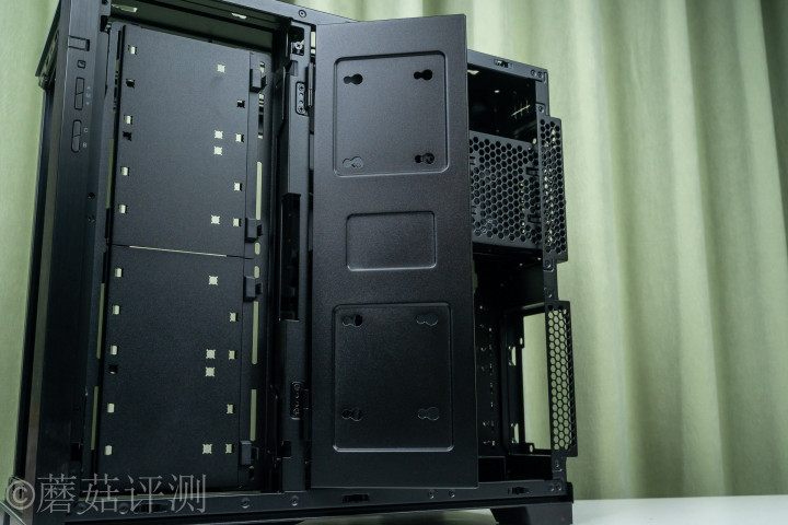▼金属盖板均支捏拆装,里面是装配框架,支捏固定水冷排或机箱电扇,最大支捏3*140mm规格。