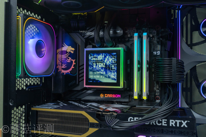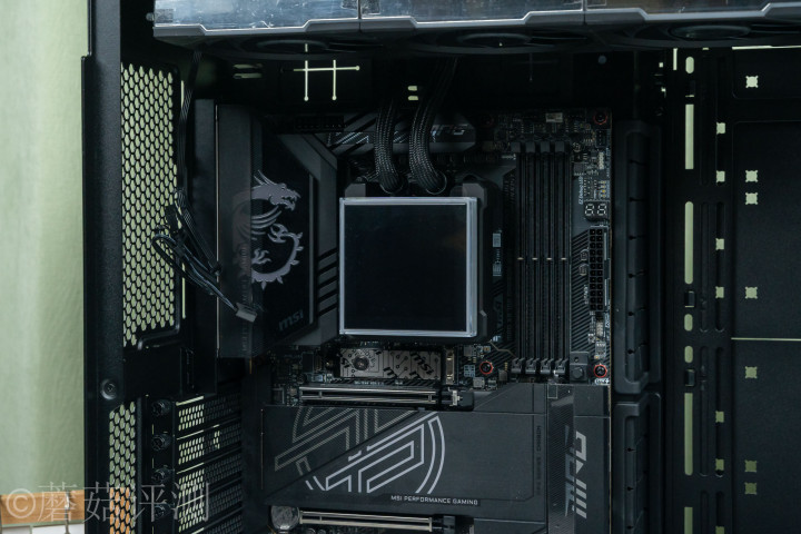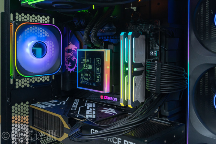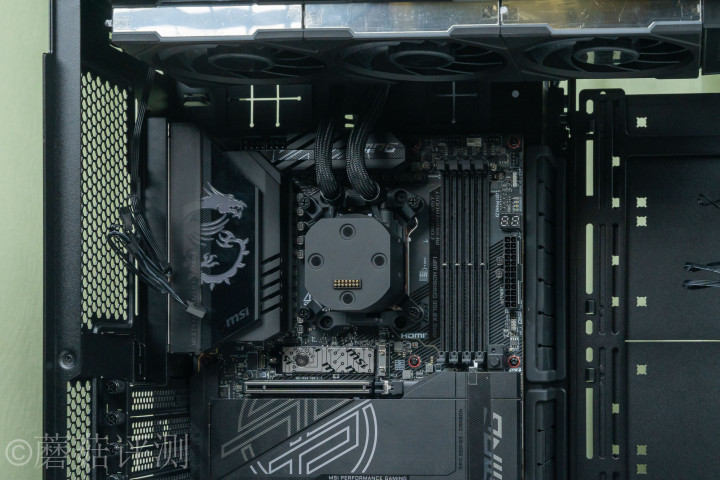 ▼水冷排这里淘气固定到机箱顶部,水冷头固定到惩办器上,水冷管从水冷头上流程,只是只败露一丢丢,视觉不雅感很棒。
