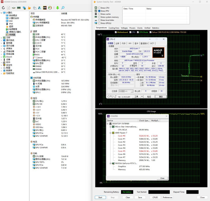 ▼通俗跑个CPU-Z的压力测试,惩办器功耗在135W左右,全中枢睿频5.4GHz,温度70℃。南桥34℃,供电44℃,显卡中枢25℃。
