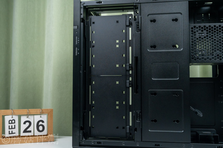 ▼左侧是机箱的侧面电扇位,标配卡扣式的硬盘托架,支捏装配固定4块2.5寸硬盘或2块3.5寸硬盘。