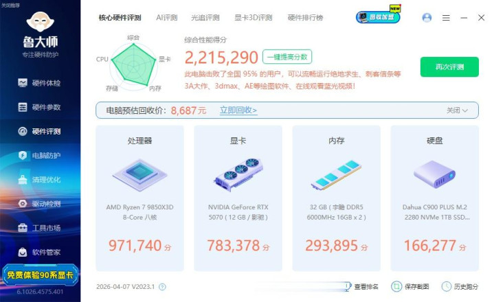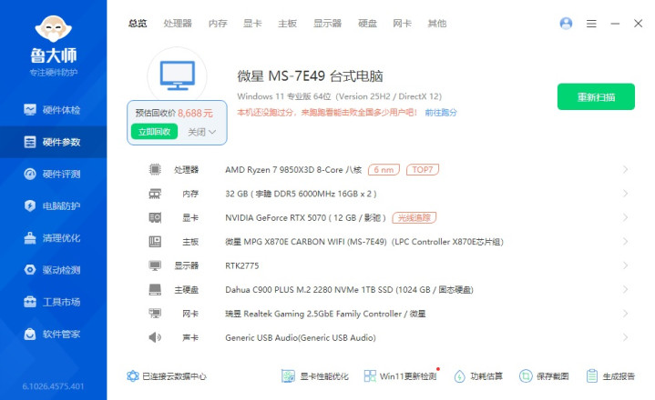 ▼通俗看下整机成立,惩办器是9850X3D,主板是微星的X870E暗黑,显卡是影驰的RTX 5070魔刃OC。