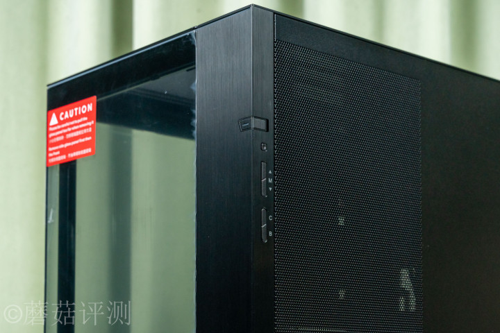 ▼侧面的上部,是机箱的按键面板,上头是开机键和重启键,底下是灯效胁制按键,可以胁制机箱灯效。