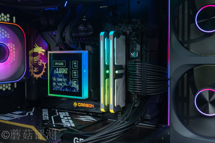 ▼内存条的RGB灯率接收多段式野心,除了内存条顶部一条完整的RGB灯带除外,其余均奥秘的会通到两种不同名义惩办的金属马甲中间,很有野心感。
