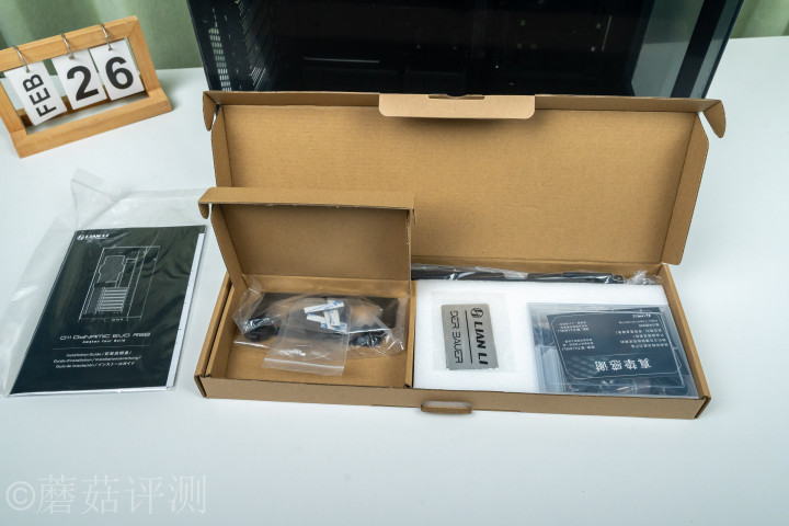 ▼纸箱内,除了机箱主体除外,还有一个配件盒,螺丝配件、诠释文献、联力LOGO贴皆在里面。