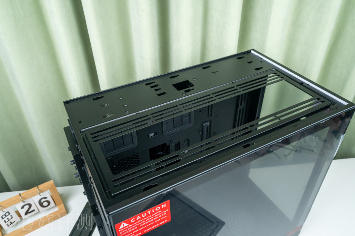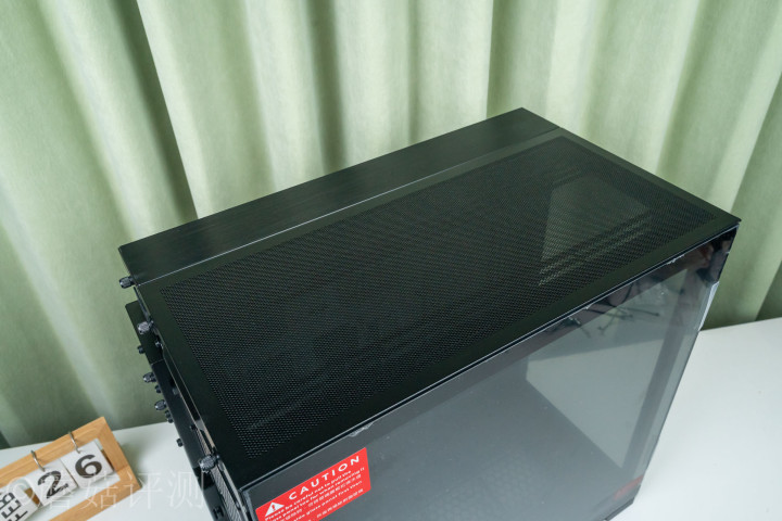 ▼机箱顶部,有两块金属盖板,小块是铝合金材质的,名义有拉丝惩办,大块是贴的,中间有密密匝匝的金属冲孔网。