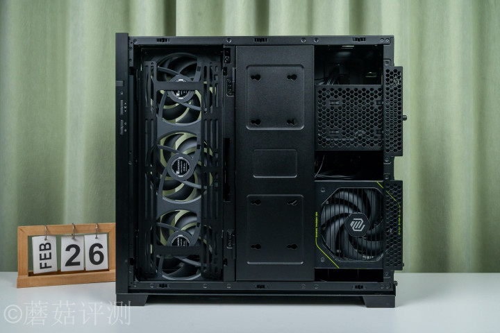 另外,包豪斯系列机箱还有另一个相配经典的野心,那即是双仓野心。机箱的主板、显卡等硬件放在前仓,保证颜值和散热;电源、硬盘以及多样线材皆放在背仓,不影响颜值的情况下,还能提供更大的拓展空间,装配更多的硬盘。