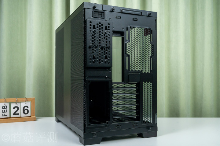 ▼机箱尾部,纯熟的双仓野心,右侧是主板IO启齿、机箱电扇位、PCIe插槽,属于前仓;左侧上部是硬盘仓,底部是电源仓,微微隆起,支捏互换。硬盘仓的上部,还有一个走线孔,套着橡胶防滑套,便捷在机箱里面装配屏幕时走视频线,联力讨论的很周密。