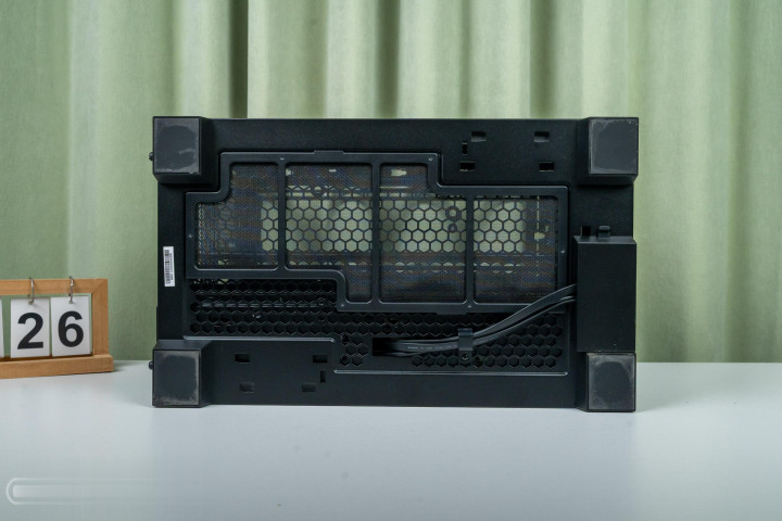 ▼机箱底部,四角是四个硕大的防滑脚垫,中间是硕大的防尘盖板,磁吸式固定,日常清算很便捷。