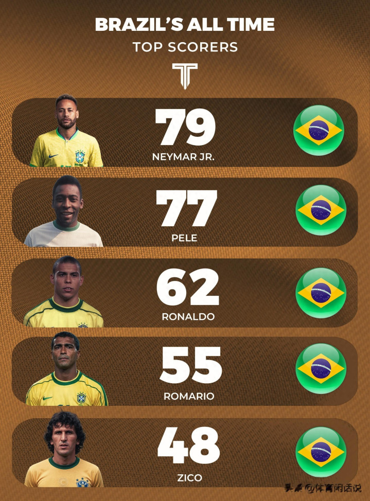 内马尔是巴西国度队历史弓手王,79粒进球力压贝利(77球)、罗纳尔多(65球)、罗马里奥(55球)以及济科(48球)。从数据到影响力,他王人早已站上巴西足球的顶峰。