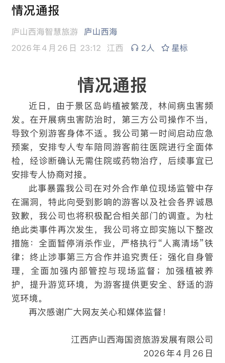 近日,由于景区岛屿植被隆盛,林间病虫害频发。在开展病虫害防治时,第三方公司操作不妥,导致个别搭客体格不适。我公司第一时刻运行救急预案,安排专东说念主专车陪伴搭客赶赴病院进行全面体检,经会诊说明无需入院或药物颐养,后续事宜已安排专东说念主协商对接。