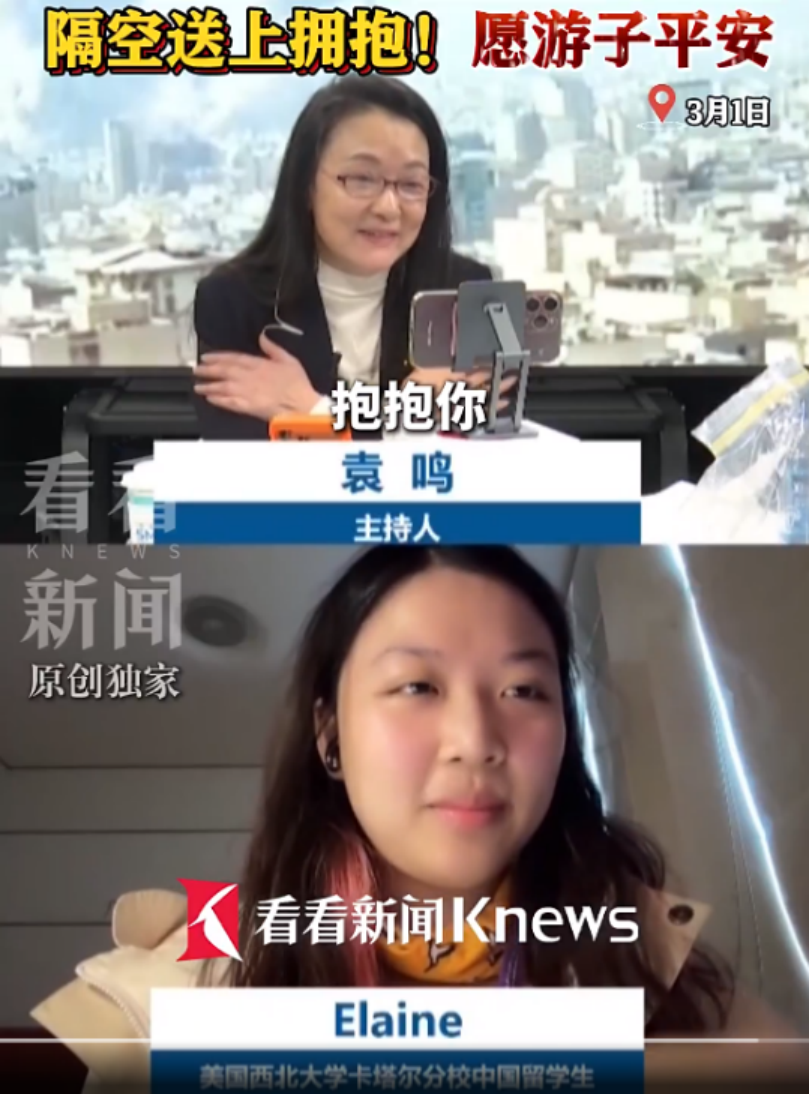连线的这位留学生Elaine,曾在袁鸣的节目组实习过。袁鸣隔空奉上拥抱,但愿别国异域的游子祥瑞,早日回到父母身边。