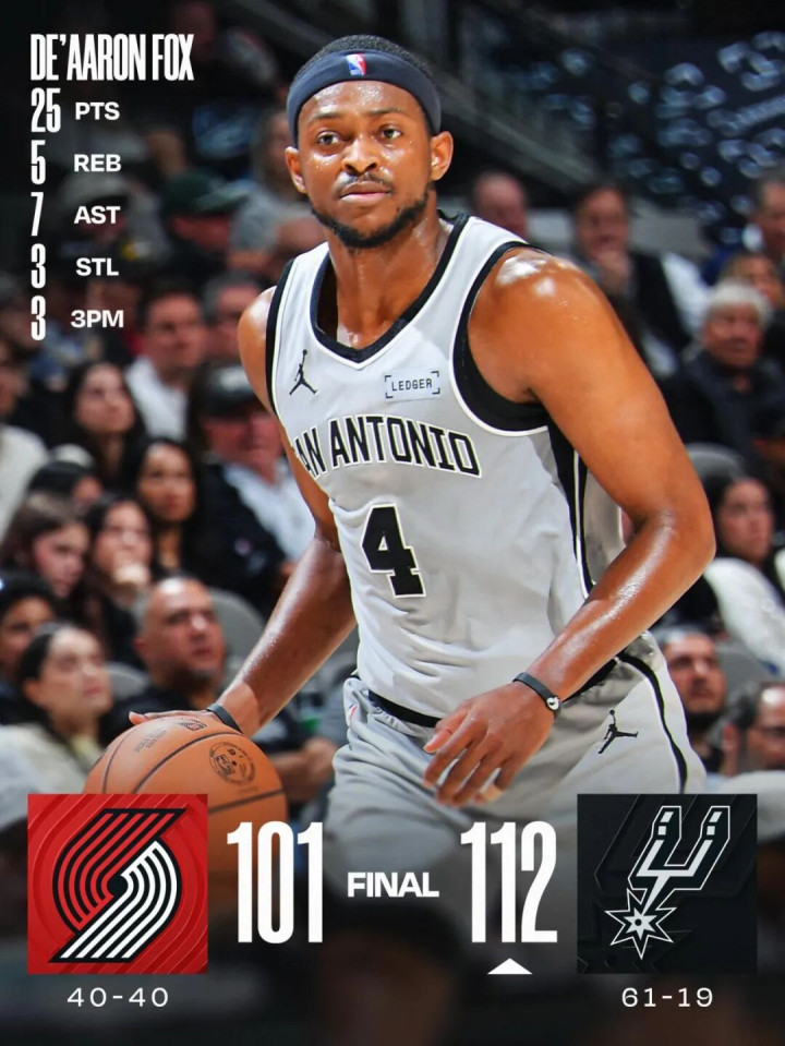 马刺另一位全明星,福克斯本场扛滚动击,全场出战34分钟,投篮20中10,三分6中3,罚球3中2,得回25分5篮板7助攻3抢断。