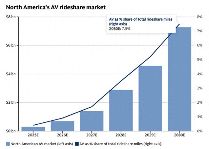 这 4,400 亿好意思元由无数具体行业的收入组成。首当其冲的是出租车、专车、班车及货运卡车司机的工资;其次是 Uber 等网约车平台分拨给司机的订单收入。淌若东说念主类算作驾驶者的价值被 AI 取代,依附于此的收益分拨机制将绝对转换。Delaney 径直点名了网约车行业:“基准预测露出,到 2030 年,自动驾驶将占据好意思加网约车总订单的 5%;悲不雅气象下,这一比例将升至 16%。”